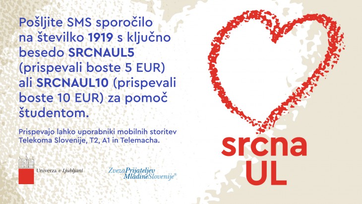 Epidemija COVID-19 je poglobila socialno-ekonomske stiske študentk in študentov Univerze v Ljubljani.Z veseljem vas obveščamo, da je Univerza v Ljubljani in Zveza prijateljev mladine Slovenije podpisala sporazum o sodelovanju v dobrodelni akciji SRČNA UL.S podpisom sporazuma med Univerzo v Ljubljani (UL) in Zvezo prijateljev mladine Slovenije (ZPMS) se je začela akcija Srčna UL. Z njo želimo pomagati študentkam in študentom Univerze v Ljubljani, ki so zaradi epidemije covida-19 ostali brez finančnih sredstev za preživetje. Mnogi med njimi so namreč izgubili študentsko delo in niso našli novega, ali pa so delo izgubili njihovi starši, skrbniki.Pomagati je mogoče s kratkim telefonskim sporočilom na številko 1919 s ključno besedo SRCNAUL5 (prispevek 5 EUR) ali SRCNAUL10 (prispevek 10 EUR). Sredstva se lahko nakaže tudi na transakcijski račun ZPMS ali s sklenitvijo donatorske pogodbe.